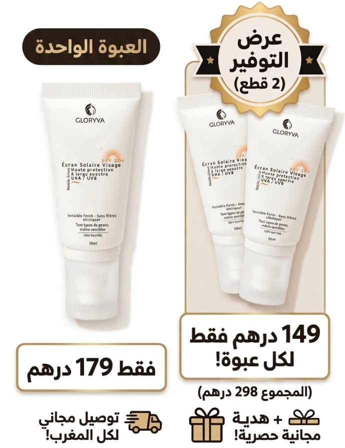 في GLORYVA، نعتقد أن الحماية من الشمس يجب أن تكون سهلة وممتعة. لهذا السبب صممنا واقي شمس سائل تمتصه بشرتك بسرعة، مع حماية عالية (UVA/UVB) ضد أضرار الشمس. يمنحك اشراقة طبيعية سيسألك الكل عنها ومقاومًا للماء و التعرق ، مما يجعله رفيقك المثالي كل يوم.